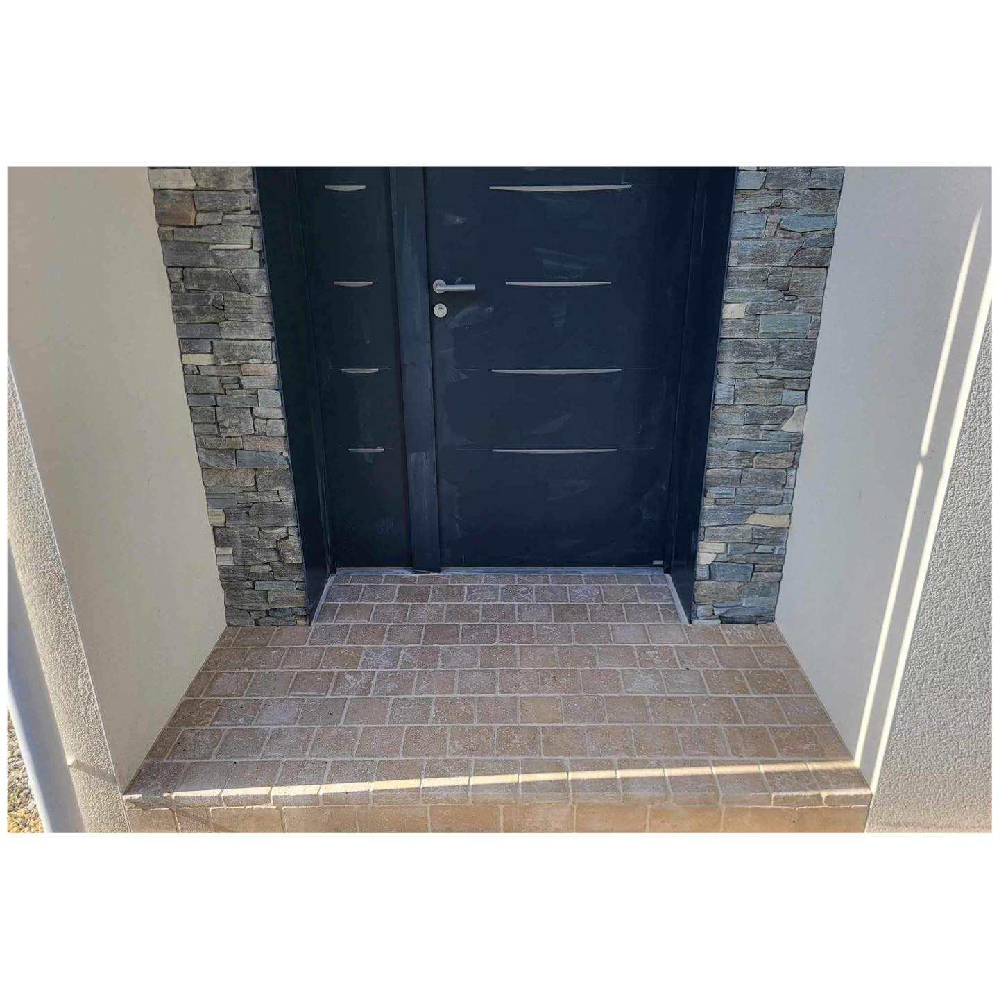 Réalisation d'un palier de porte d'entrée en dallage 4 formats Sinaï à Guérande (44) | © BELLIOT TP